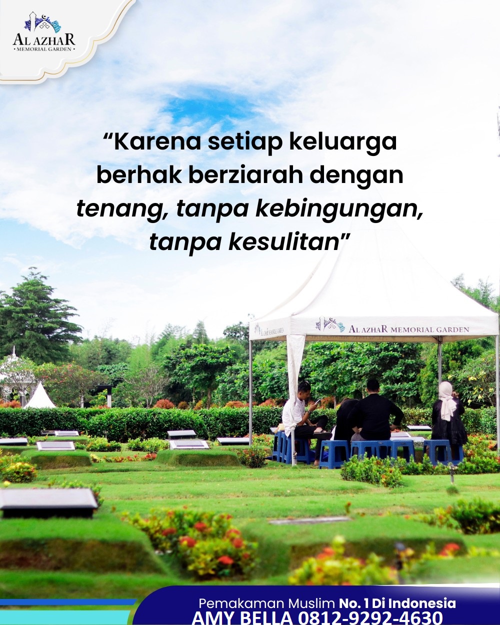 ”Amy siap membantu Bapak Ibu dalam menentukan dan memberi rekomendasi kavling lahan makam sesuai dengan budget dan keperluan bapak ibu, juga menjadi konsultan pendamping yang siap dalam hal memberikan semua informasi yang lengkap mengenai Pemakaman Al Azhar Memorial Garden”